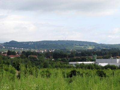 The Betzenbach stream near the mountain contains coal remnants, indicating past transportation routes from the former Consolidiertes Nordfeld mine operations.