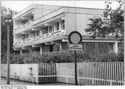 The former Iraqi Embassy in Pankow is a building constructed from prefabricated elements using East German building methods. The structure displays typical functionalist design with simple, practical forms.