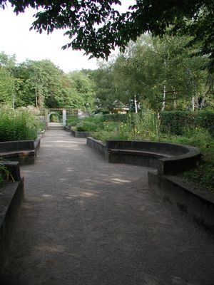 The park maintains its 1920s character through preserved perennial gardens and seating niches, despite substantial changes to its size during the 1950s construction period.