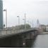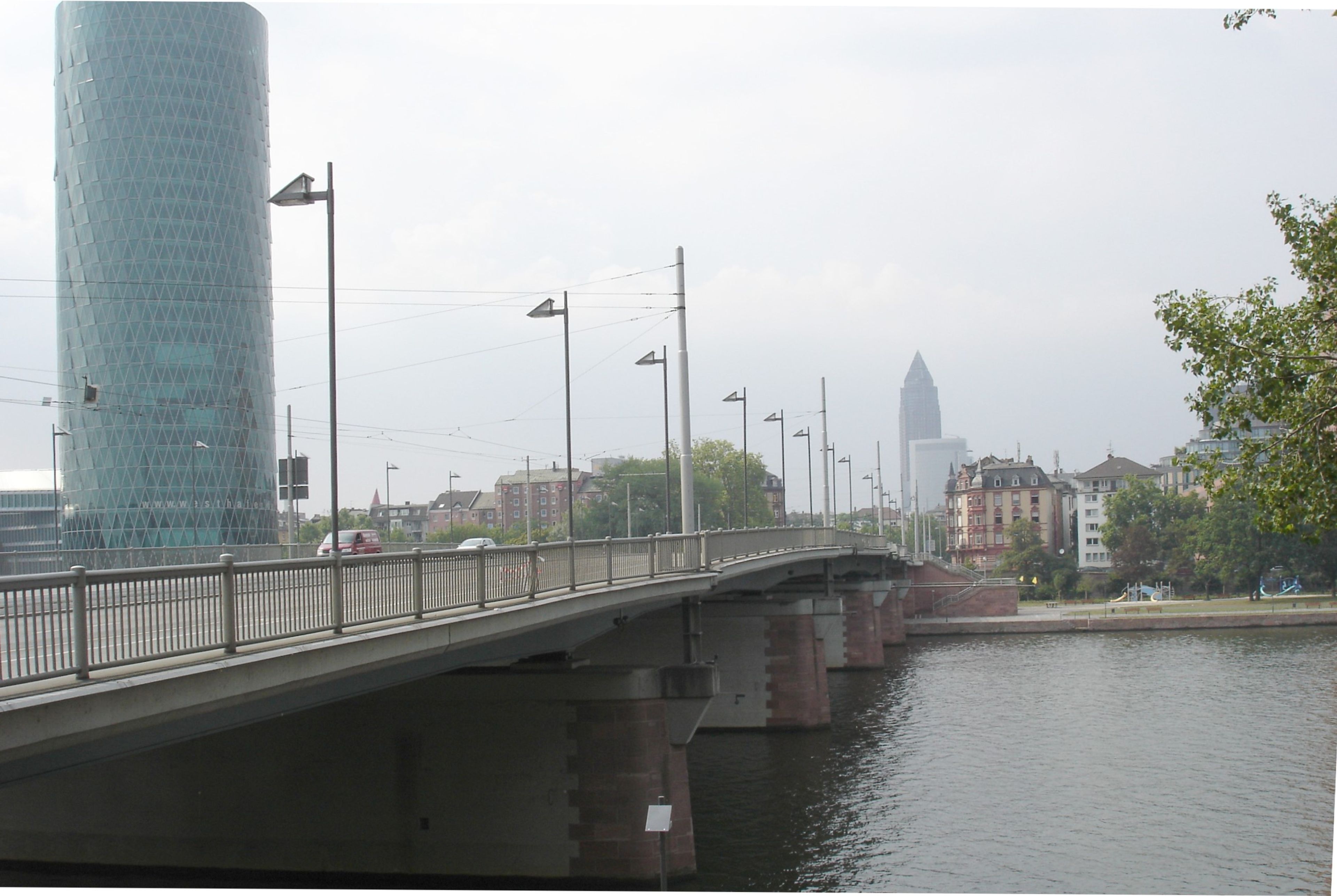 The Friedensbrücke spans 287 meters across the Main River, connecting Baseler Platz in Gutleutviertel with Stresemannallee in Sachsenhausen through multiple traffic lanes.