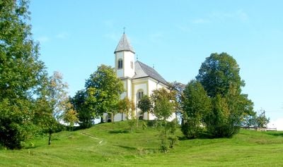The Visitation Church is a pilgrimage building standing on a high plateau overlooking the Marktschellenberg valley. Inside, five altars and elaborate ceiling frescoes create a richly decorated sacred space, with a stone tower rising from the roof.