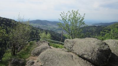 The granite rock formation rises 30 meters above ground on the western slope of the Northern Black Forest at 700 meters elevation.