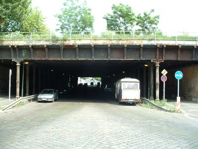 This structure remains one of Berlin's last major railway bridge constructions from 1900 preserved in its original form, featuring distinct Hartung column design.