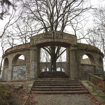 A 13-meter hill within the park contains a memorial structure with walls displaying names of soldiers from both World Wars.