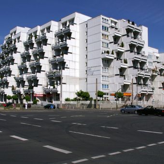 Hannibal is a residential skyscraper in Dortmund's northern district standing about 50 meters tall. The building contains many apartments within a solid concrete structure typical of housing blocks from that era.
