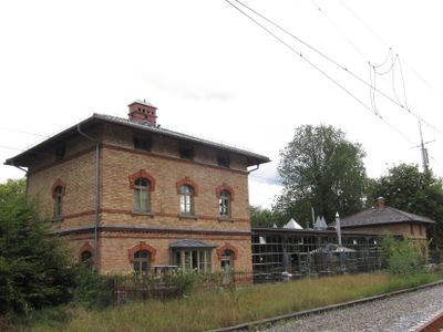 The building, constructed with red and yellow bricks, represents the architectural style characteristic of early Isar Valley stations in Bavaria.