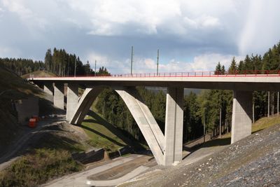 The Grubentalbrücke spans 215 meters across a valley with its 90-meter-wide central arch, carrying two railway tracks at 35 meters above ground level.