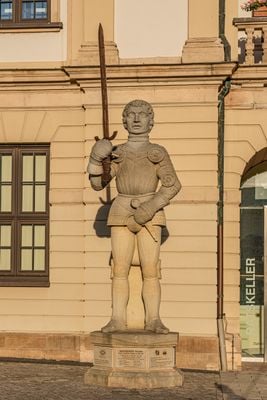 The sandstone statue stands 4.8 meters tall, depicting a knight with a drawn sword representing municipal freedom and independence.