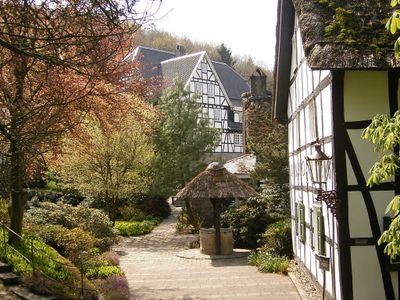 Gut Hungenbach consists of multiple timber-framed buildings spread across spacious grounds, featuring 26 rooms with modern bathrooms and conference facilities.
