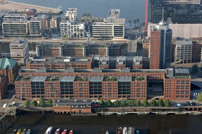 The building complex integrates modern architectural elements while maintaining visual connections to the neighboring historical Speicherstadt warehouse district.
