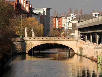 The Hallesche-Tor Bridge stretches across the Landwehr Canal, connecting different sections of Berlin's Kreuzberg district with its classic 19th-century architecture.