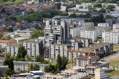 The 65-meter-tall office building features a 17-floor central tower surrounded by five-story wings, providing 45,608 square meters of rental space.