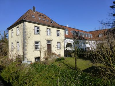 The stone structure of Haus Düssel stands near a water source, featuring defensive elements and residential quarters characteristic of medieval German architecture.