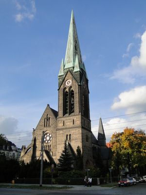 Herz-Jesu-Kirche is a Gothic Revival parish church in the Striesen district, distinguished by its 68-meter-high copper-roofed tower and basilica layout with six bays. Modern stained glass windows by Bruno Seener, depicting biblical scenes, fill the single-bay choir at the eastern end and replace those lost during World War II.