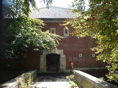 The structure represents wartime adaptation through its design, which mimics historical fortifications to integrate with Münster's traditional architectural landscape.