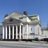 The theater displays six Ionian pillars supporting a triangular gable with an inscription of Friedrich Schiller's quote from Homage to the Arts.
