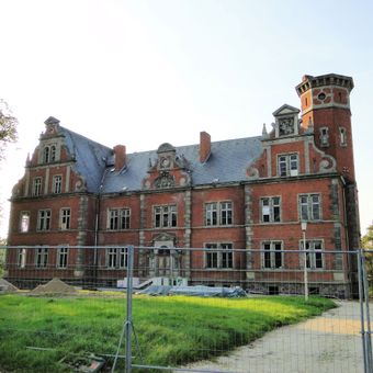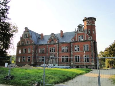 The yellow brick and sandstone manor displays Neo-Renaissance design with Dutch influences, featuring prominent side risalits and gabled windows across two floors.