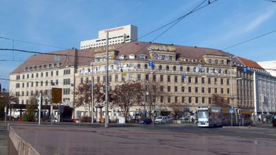 Before the hotel construction, the site housed the Leipzig Fire Insurance building, and the original main entrance faced the central station on Kurt-Schumacher-Strasse.