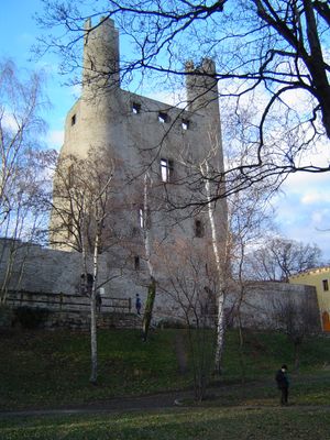 Burgruine Hoher Schwarm is a castle ruin with a square layout located in the town of Saalfeld. Two round towers still stand and overlook the Saale River below.