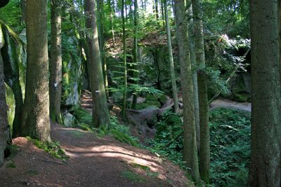 The double gorge formation contains sandstone caves, ledges, and platforms shaped by natural erosion within dense fir forest surroundings.