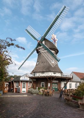 The mill stands as the sole building on Norderney with a traditional thatched roof, representing local architectural methods and milling traditions.