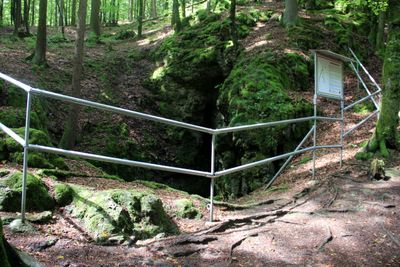 Windloch is a sinkhole and cave in Hartenstein that formed when soluble rock dissolved beneath the surface. It extends roughly 15 meters (49 ft) in depth and 10 meters (33 ft) across, with a noticeable opening at ground level.
