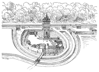 The fortification features a high residential tower surrounded by moats fed by the Schwarzbach river on three sides of the horseshoe-shaped courtyard.