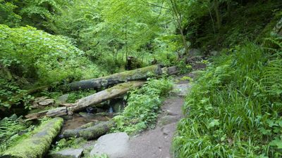 The Wolfschlucht forms a steep gorge with cascading waterfalls, fallen trees, slippery rocks, and a creek flowing through its narrow passages.
