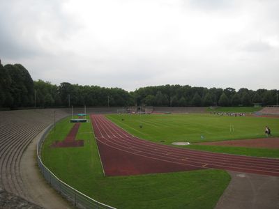 The Stadion Gladbeck features a natural grass field, running track, and grandstands that accommodate up to 37,612 spectators within its traditional architectural design.