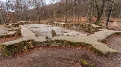 Jostbergkloster is a Franciscan monastery site in the Teutoburg Forest southwest of Bielefeld, with the church foundations rising about 3 feet (1 meter) above ground. The visible ruins show a single-nave structure with three bays and a choir roughly 30 feet (9 meters) wide.