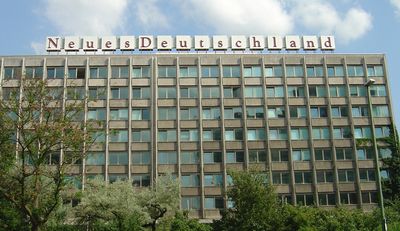 Built between 1969 and 1974, the structure replaced the Ostbahn train station reception building and served as headquarters for the SED newspaper Neues Deutschland. The site and publication were central to East German identity during this period.