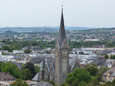 The Johanneskirche stands in central Giessen with dark stone walls, light sandstone bands, and the tallest church tower in the city at 72 meters.