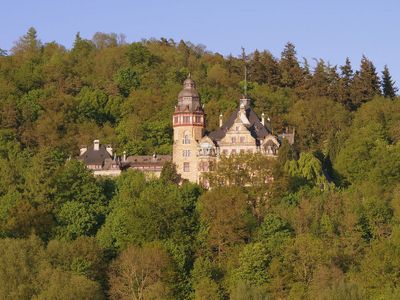 The castle stands on a hill near the Werratalsee lake, featuring architectural elements from 1904 with a prominent tower and symmetrical wings.