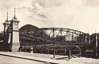The Schlütersteg crossed the Spree River with a steel truss construction measuring 50 meters in length and providing 5 meters of clearance for river traffic.
