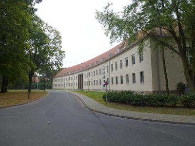 The Julius-Leber-Kaserne extends over 80 hectares and contains 108 main buildings arranged symmetrically around a central axis with an oval ring road.