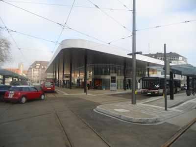 The square serves as the main public transportation intersection, connecting multiple tram and bus lines with direct access to parking facilities.