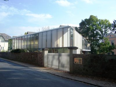 The church structure follows a triangular floor plan with glass walls, steel elements, and concrete components, creating an open religious space in Niederlößnitz district.