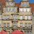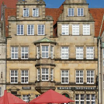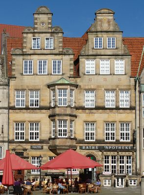 The Raths-Apotheke building features a central gable and oriels constructed with yellow Silesian marble on the facade of Bremen's Market Square.
