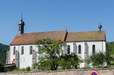 The monastery is an archaeological site in Gemünden am Main featuring a hall church with Gothic design, marked by plastered masonry walls with sandstone trim and buttresses on the southern side. The complex is enclosed by an original stone wall from 1712 with a decorated pillar gate.
