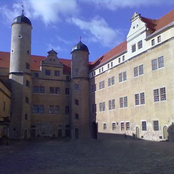 Castle Lichtenburg features a Renaissance architectural design with multiple wings and stands on elevated ground overlooking the surrounding Saxon countryside.