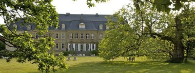 The property includes period-furnished salons, antique decorations, and a library extension from 1907 that maintains the historical character of German nobility.