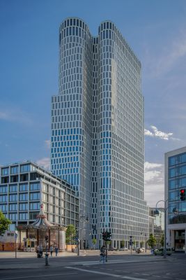 Upper West is a modern high-rise in Berlin-Charlottenburg with 33 floors rising 119 meters. The building combines office spaces, a hotel, and retail areas, creating a mixed-use complex that shapes the local skyline.