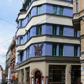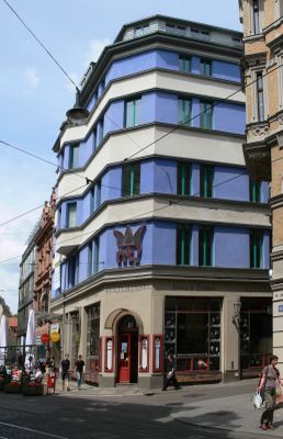The five-story structure incorporates transparent facades with colored opening wings and features vertical lettering on its fire wall facing Spiegelstraße.
