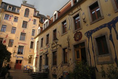 The Kunsthof Passage contains five different courtyards connected through passages between Alaunstrasse 70 and Görlitzer Strasse in Dresden's Neustadt district.