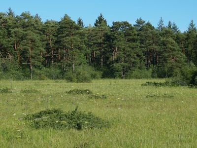 The Königsbrunner Heide spans across an area characterized by pine forests and meadows, creating a diverse ecological environment for numerous plant species.