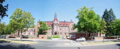 The former hospital now functions as Bürgeramt 3, housing administrative offices and the registry office for the Neukölln district.