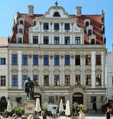 Master builder Johannes Holl merged multiple structures into one building in 1578, creating a unified northern facade for wealthy residents of Augsburg.