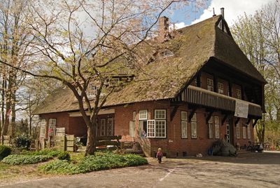 Landhaus Mahr exhibits red brick masonry construction with wooden sash windows and a thatched half-hip roof featuring dormers and large gables on both sides.