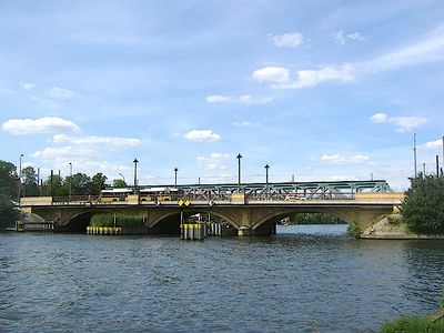 The Lange Brücke spans across the Dahme River, connecting the old town of Köpenick with western districts through its stone arch structure.