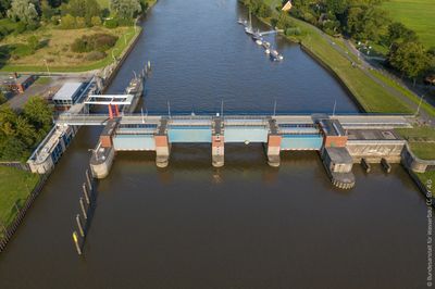 The Lesum Barrier spans across the Lesum River, featuring engineering systems that control water flow between the districts of Vegesack and Burglesum.